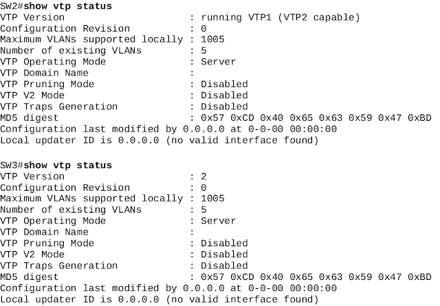 Bạn có thể thấy là không có gì thay đổi trên sw2 và sw3. Đây là lý do tại sao chúng ta cần cấu hình VTP domain-name.